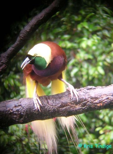 The Greater Bird-of-paradise is a large bird that can be up to 43 cm long. The male is maroon brown, with a yellow crown, dark emerald green throat, and a blackish brown breast. It has large, yellow flank plumes, with a pair of long tail wires. The female is maroon brown, with a darker head and a lighter belly and a yellow or white beak.