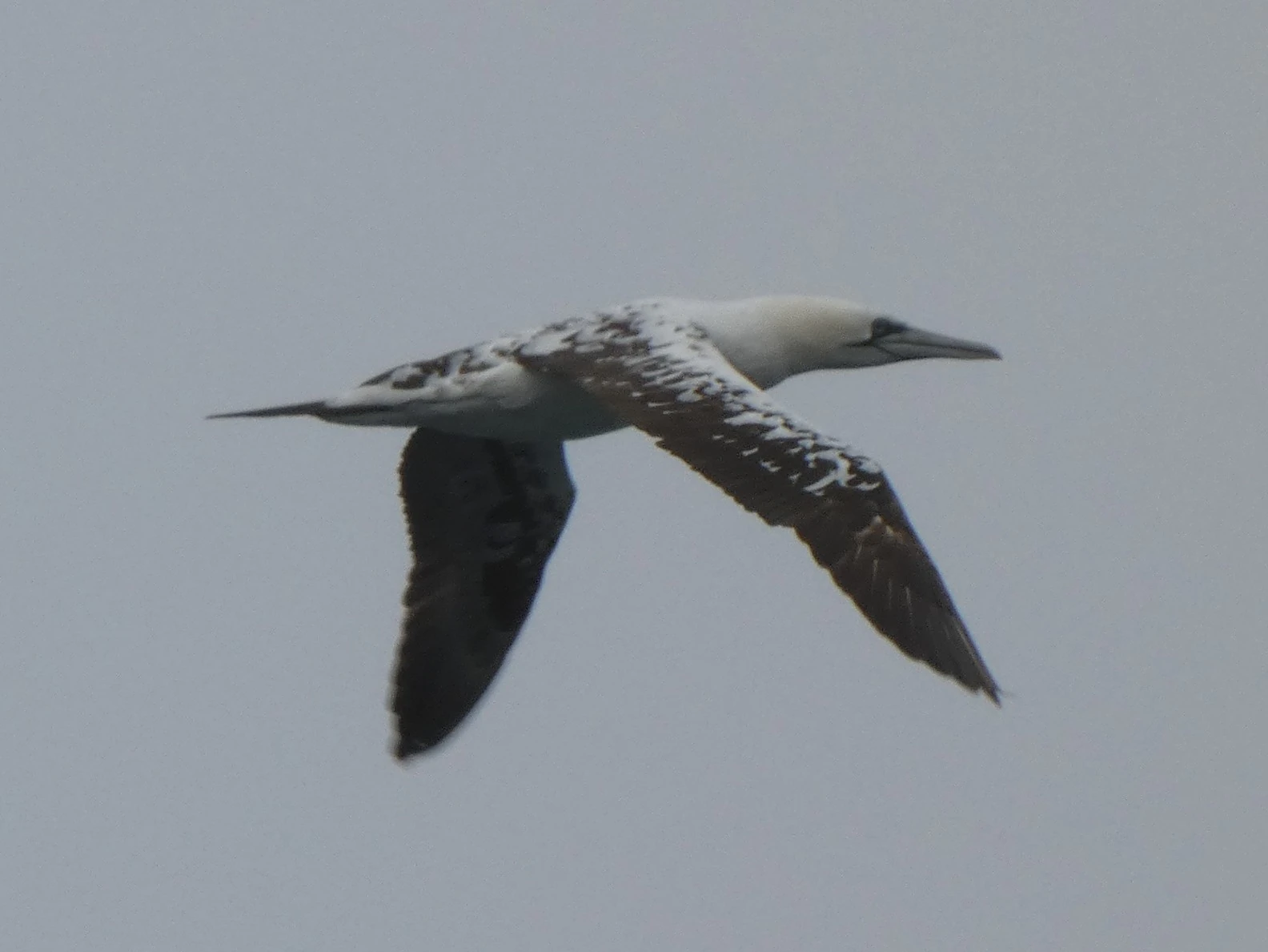 The Northern Gannet is the largest seabird of the North Atlantic, nearly matching a Canada Goose in size. The male is, on average, slightly larger than the female. The Gannet is unmistakable, with a streamlined body, a pointed bill, a short, pointed tail, and long, narrow wings. The adult has an almost entirely white plumage with black wingtips and a tinge of buff on the nape, which becomes more intense in the breeding plumage, especially in the male. The juvenile is mostly dark brown in colour, with a tiny white spot on the tip of every feather. The bird gradually becomes whiter with each molt, eventually reaching the mature plumage at 5 years of age.