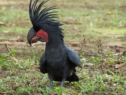 Palm Cockatoos have an almost entirely black plumage, with some grey. They also have a black beak, but their cheek contours are a bright red. As with all cockatoos they have a head crest. They are about 60 cm long.
