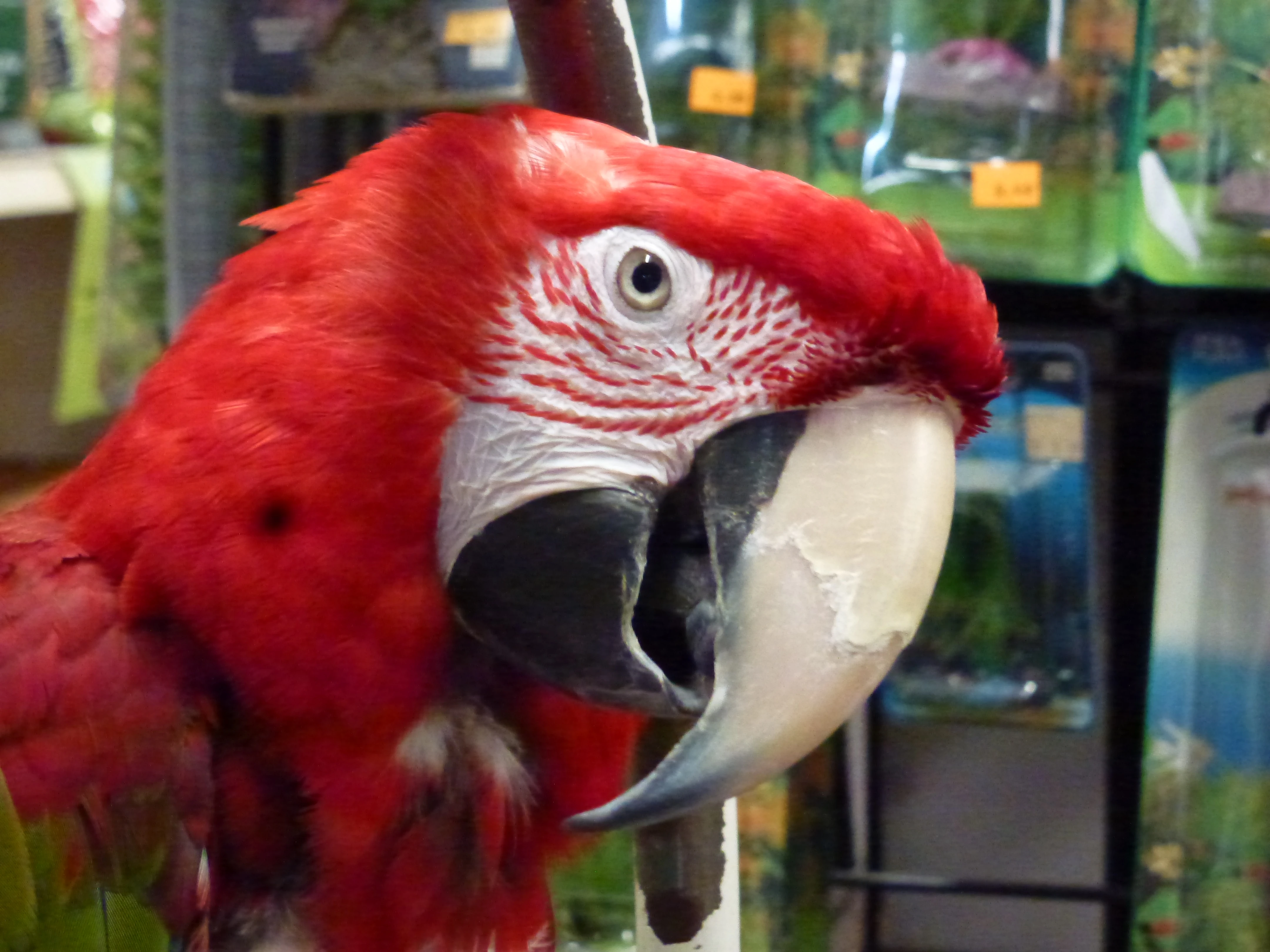 There is bare white skin around the eye and from there to the bill. Tiny white feathers are contained on the face patch. The upper mandible is mostly pale horn in color and the lower is black. Juveniles have dark eyes; adults have light yellow eyes. It is frequently confused with the slightly larger green-winged macaw, which has more distinct red lines in the face and green istead of yellow in the wing.